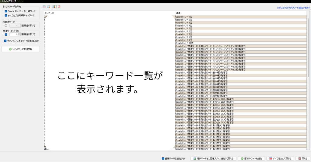 今この瞬間に検索数が急上昇している「トレンドワード」を抽出する機能も備わっています。