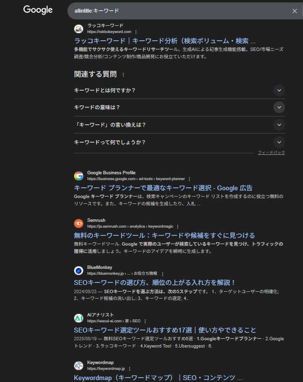 試しに「allintitle:キーワード」手動で検索するとこのように、タイトルに必ず「キーワード」という文言が含まれているサイトしか出てこなくなります。