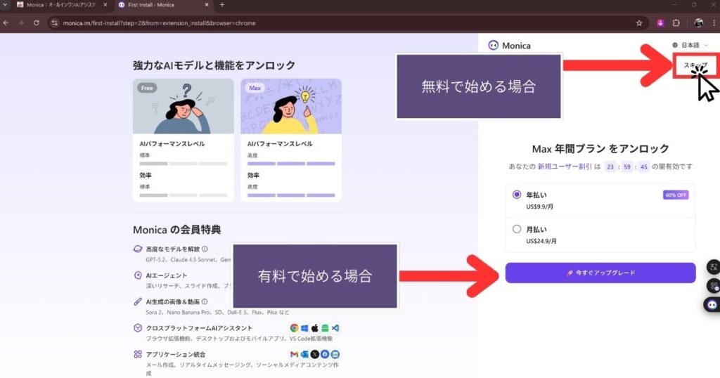 無料で始める場合は「スキップ」
