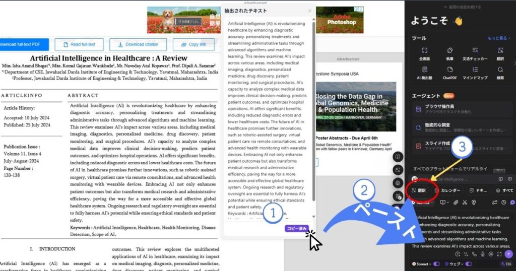 また手順で紹介しているページは海外の論文で、コピーができない仕様になっています。実際にOCRを使用して文字を起こし、その後翻訳を行います。