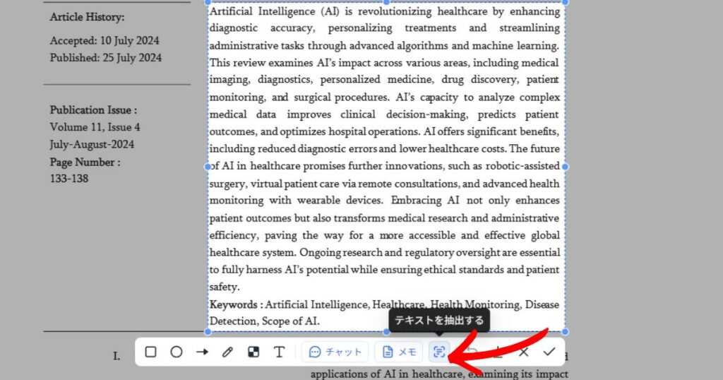 「テキストを抽出」ボタンを押すことにより、瞬時に画像の文字をコピー可能なテキストに抽出してくれます。