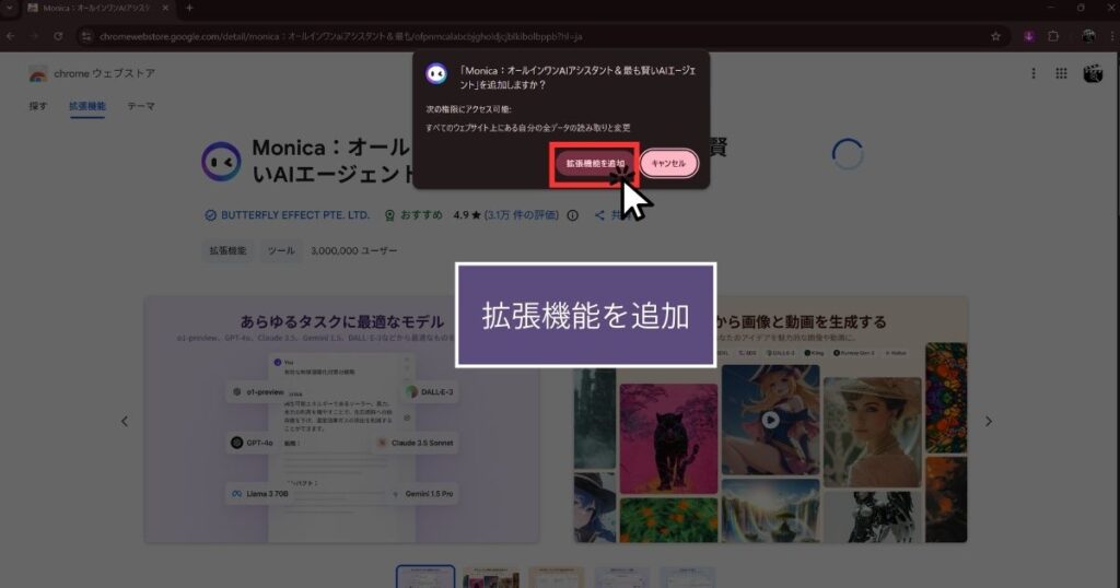真ん中に表示されるポップアップの「拡張機能を追加」をクリック。