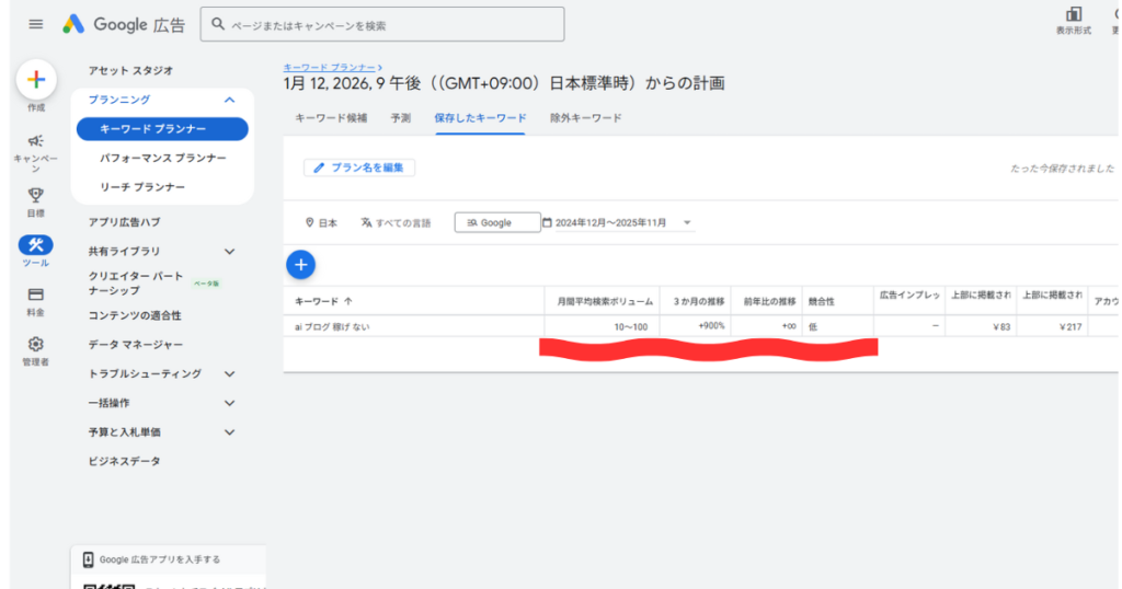 検索ボリュームの確認は「キーワードプランナー」を利用します。