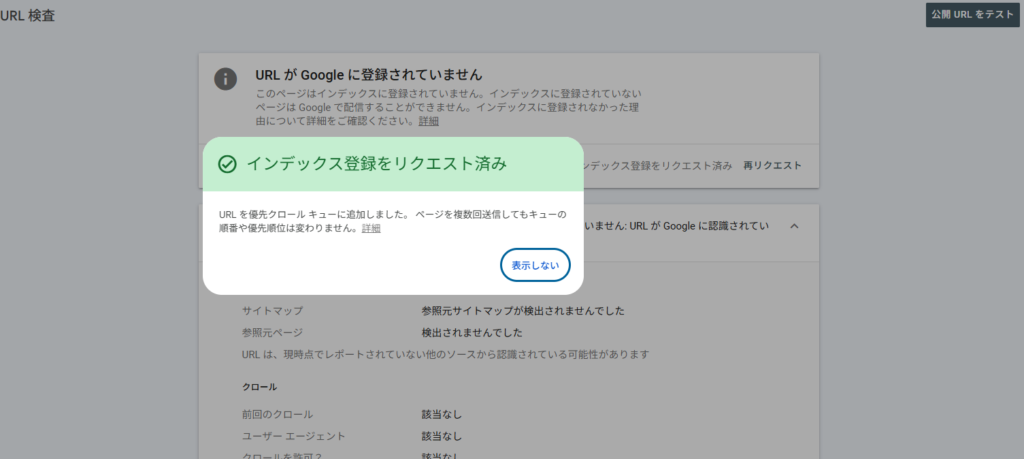 記事を公開したら、必ずGoogleサーチコンソールから「インデックス登録のリクエスト」を送りましょう。お宝キーワードはライバルが少ないため、Googleに認識されればすぐに上位表示される可能性があります。