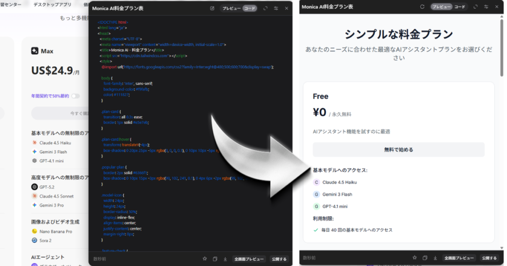 ページとチャットをクリックし、”このページの料金表を元にHTMLコードを作成して”