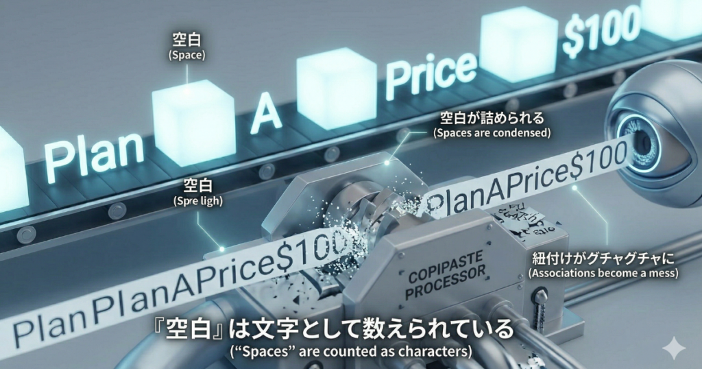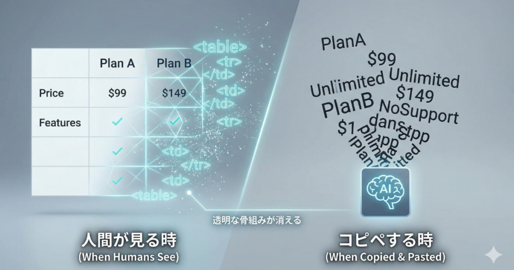 ブラウザ上では、「広い余白」を使って列を整えているように見えても、AIにとってその余白は意味を持たない、あるいは不安定な文字の並びにすぎません。