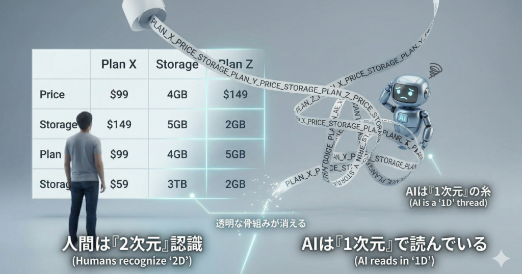 人間は表をパッと見て、「縦(列)」と「横(行)」を同時に認識できますが、AIの読み方はもっと不器用です。