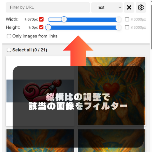 拡張機能のアイコンをクリックすると、ページ内の画像がズラッと一覧表示されます。 このままだとアイコン画像やバナーまで混ざってしまうので、「Filter」機能を使います。